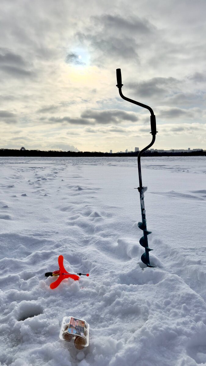 На подледную рыбалку я ездила лишь раз и мучился со мной арендованный на Волге егерь Олег, с которым мы смогли поймать пару ершей и подлещика. Теперь было решено закупить кучу всего самостоятельно и отправиться на свой первый лёд без опытного человека. Поехала на домашний водоем. Лед оказался довольно толстым, где-то 30-40см, в некоторых местах около 20см. Немудрено, две недели подряд температура была -20 и ниже, а на затоне всегда ветер. Льда под снегом не видно, оно и хорошо - не так страшно идти было :D Итак, купив жерлицы, карасика-живца (он, кстати, за пару дней до этого сдох, пришлось прям перед рыбалкой бежать за новым), поставушки, зимний спиннинг, вибы и блесна, червей\мотылей\опарыша, я готовилась собирать трофеи. На улице было -9, солнышко и небольшой ветерок. Первую ошибку, которую я сделала - не взяла с собой черпак или шумовку, чтобы убирать шугу из лунки. Лунки, кстати, замерзали буквально за несколько минут и приходилось их расковыривать, чтобы поставушки оставались спо
