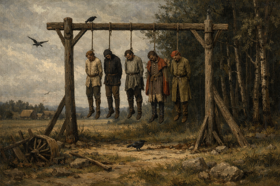Взглядам помещиков предстала воздвигнутая на лесной опушке П-образная виселица, на длинной перекладине которой слегка раскачивались под осенним ветром пять человеческих тел. Разом притихшие гуляки шагом подъехали вплотную, чтобы как следует разглядеть казненных, на руках и ногах которых все еще оставались кандалы.
