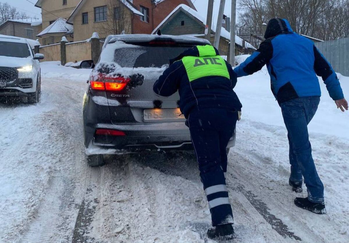 Сотрудники ДПС вытолкали застрявшие автомобили на подъеме в Калуге