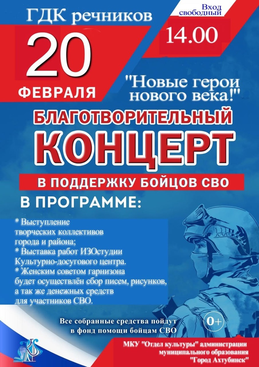 ☝ 👉20 февраля в ДК речников состоится благотворительный концерт ко Дню защитника Отечества — «Новые герои нового века!». 🇷🇺На концерте будет организован сбор средств в поддержку военнослужащих, участвующих в специальной военной операции. 📌Начало - в 14.00. Вход свободный. 👉 Оставайтесь в курсе событий! 🟣 «Мой Ахтубинск» в МАХ 🔵 «Мой Ахтубинск» в ВК