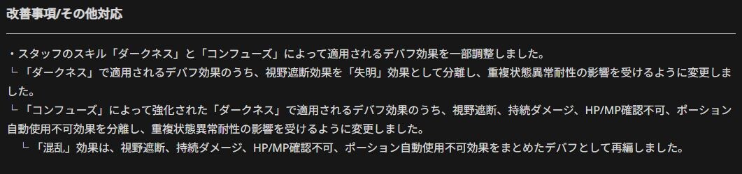 Внесены корректировки в механику действия негативных эффектов от навыков персонажей «Тьма» (Darkness) и «Замешательство» (Confuse). Эффект блокировки обзора, накладываемый навыком «Тьма», теперь выделен в отдельный статус «Слепота». На него распространяется действие сопротивления к повторяющимся (накапливающимся) аномалиям. Эффекты от усиленной версии «Тьмы» (при взаимодействии с навыком «Замешательство») разделены. Блокировка обзора, периодический урон, невозможность проверить HP/MP и отключение автоприменения зелий теперь объединены в единый статус «Смятение». Этот новый статус также зависит от сопротивления к повторяющимся аномалиям. Это улучшение должно появится у нас с 25 марта.