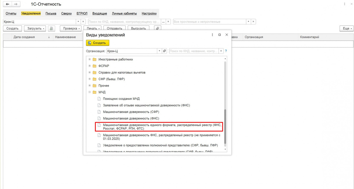 Для создания МЧД необходимо перейти в раздел Отчеты - Регламентированные отчеты – Уведомления – Создать – МЧД – Машиночитаемая доверенность единого формата распределенный реестр (ФНС, Росстат, ФСРАР, РПН, ФТС).