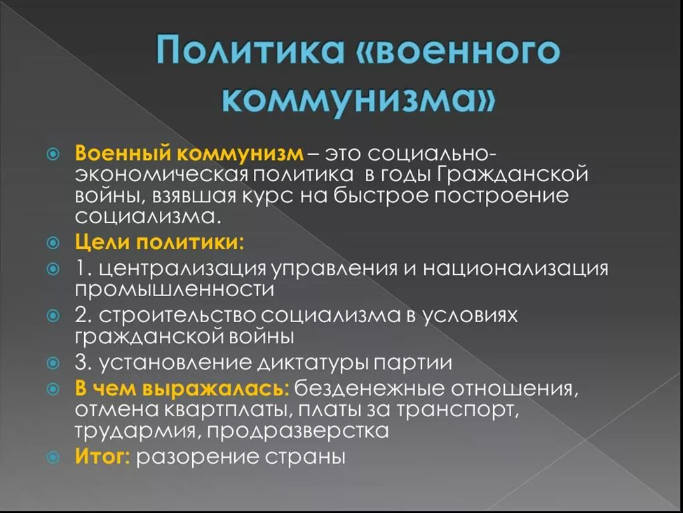 Основные цели военного коммунизма кратко.