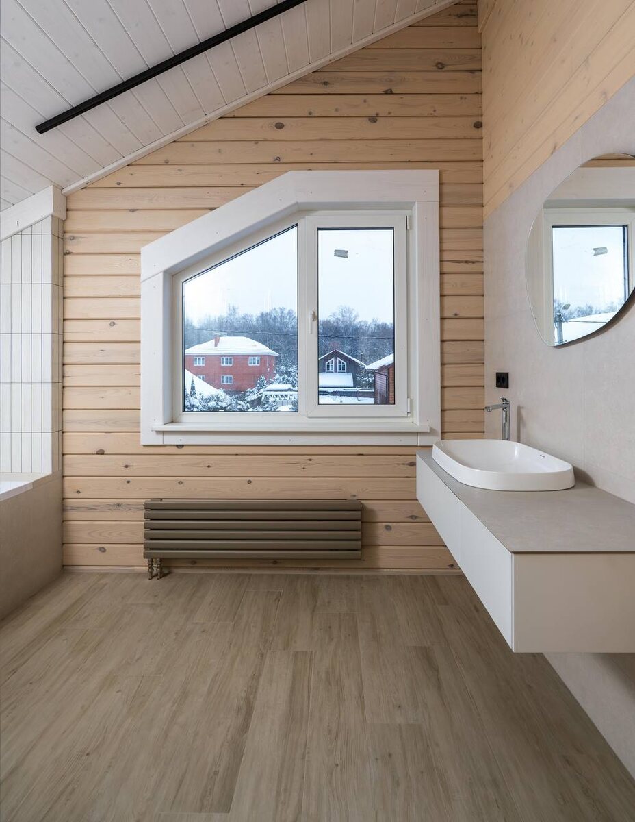 Как выглядит санузел со строительным душем на первом этаже — мы показали в предыдущей статье. Здесь сразу чувствуется пространство и воздух. 😌Помещение получилось объёмным за счёт скошенного потолка, света и свободной планировки. 📌 Отдельно про ванну. Это одно из самых логичных решений для дома с двумя санузлами: в одном — строительный душ, во втором — полноценная ванна. Особенно это актуально для семей с детьми. 👧🏼 👦🏻 И, конечно, про визуал. Сочетание цветов, материалов, пропорций — всё смотрится гармонично и спокойно. Здесь большая заслуга заказчиков и работы дизайнера. Делитесь в комментариях, как вам сочетание цветов и атмосфера пространства. 👇 Дом из бруса камерной сушки по проекту «Аврора» площадью 177 кв.м 📍 в Серпуховском районе