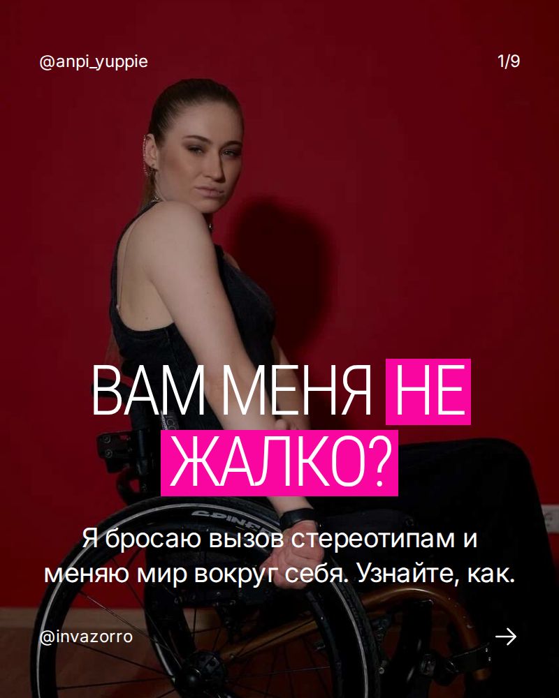 Меня зовут Анастасия Анпилогова. Я основатель проекта «ИнваЗорро», эксперт по доступной среде, мотивационный спикер и… да, девушка на инвалидной коляске.