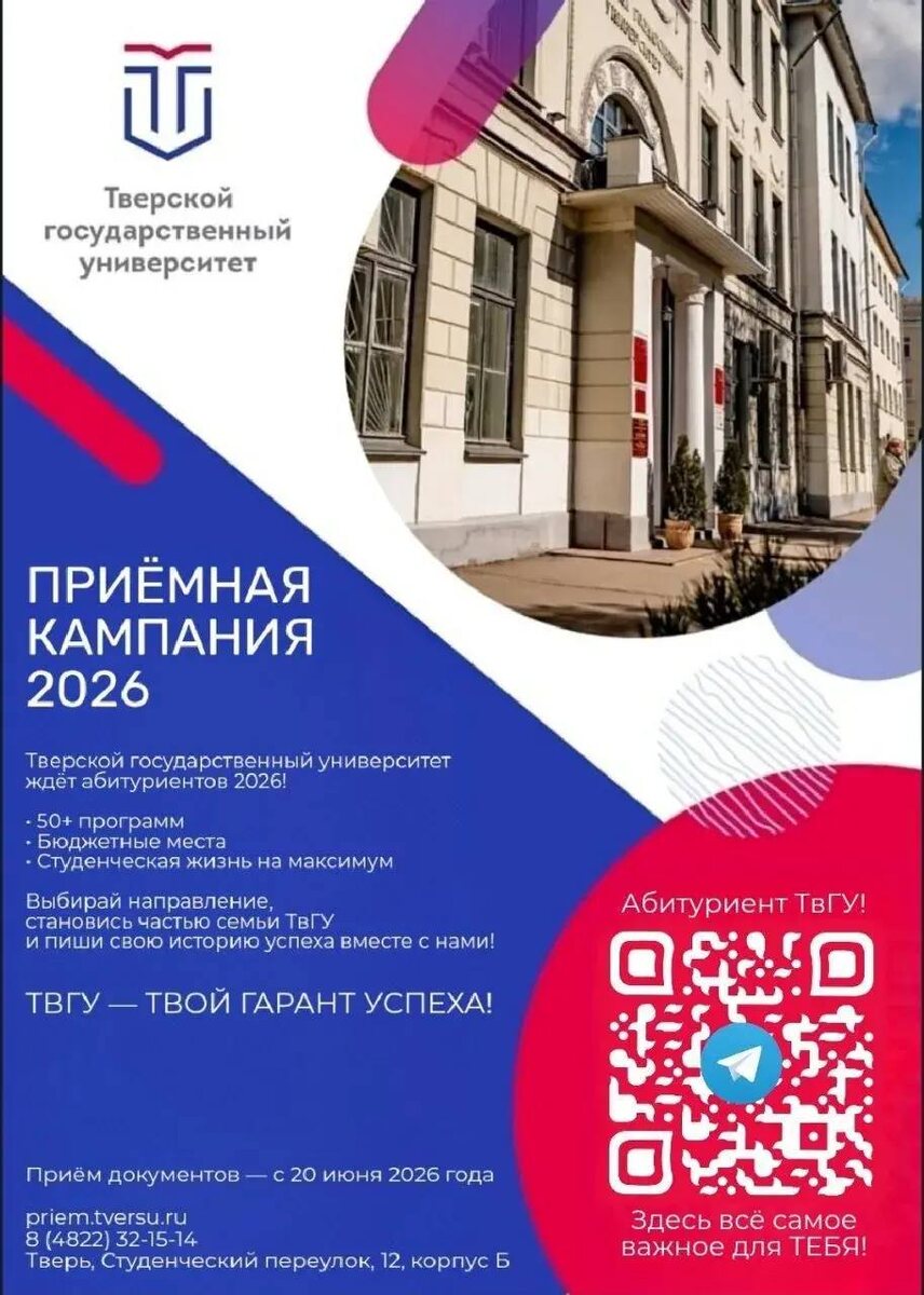 ТВОЁ БУДУЩЕЕ НАЧИНАЕТСЯ ЗДЕСЬ Мечтаешь о качественном образовании, насыщенной студенческой жизни и востребованной профессии? Пора сделать первый шаг! ТвГУ — это: Фундаментальные знания и современные практики Преподаватели с большим опытом и учёными степенями Творческая, спортивная и научная жизнь Диплом, который ценят работодатели Главные даты приёмной кампании-2026 (бакалавриат и специалитет): 1 марта 2026 — вступление в силу Правил приёма. 20 июня 2026 — старт работы приёмной комиссии в очном формате. Следи за обновлениями! Рассказываем о полезных для поступающих разделах сайта ТвГУ: • Правила приёма на обучение, утверждённые ТвГУ: https://clck.ru/3RsBXj
