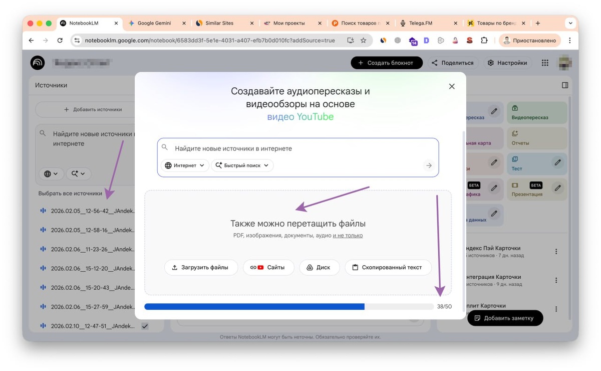Вот так я загружают в Google NotebookLM файлы обзвонов клиентов в notissimus.com (где-то 10 - 15 в день звонков