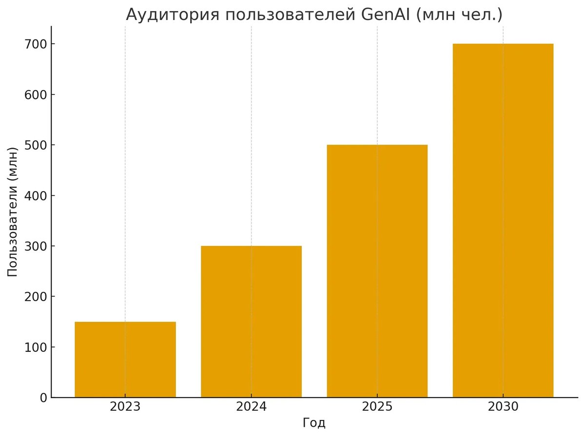 - Аудитория пользователей GenAI-инструментов: рост с 150 до 700 млн.