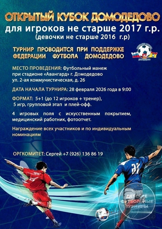 р. — 28 февраля 2026 года!» Приглашаем юных футболистов принять участие в захватывающем турнире в Домодедово! Это ваш шанс: -показать мастерство на поле; -сыграть в дружной команде и почувствовать дух соперничества; -получить заряд бодрости и ярких эмоций; -завести новых друзей‑единомышленников. Дата: 28 февраля 2026 года. Место: футбольный манеж «Авангард» (г. о. Домодедово, микрорайон Северный, ул. 2‑я Коммунистическая, д. 2б). Возрастное ограничение: участники не старше 2017 года рождения. Формат: групповой этап + плей‑офф. Награды: медали и подарки всем участникам, специальные призы лучшим игрокам. Почему стоит участвовать? -качественное искусственное покрытие; -комфортные раздевалки; -профессиональное судейство; -фотоотчёт с турнира; -присутствие медицинского работника. Как зарегистрироваться: Позвоните по телефону: +7 (926) 136‑86‑19 (Сергей). «Не упусти свой шанс забить гол мечты! Регистрируйся сейчас — и выходи на поле 28 февраля!» -— #ФутбольныйТурнирФевраль2026 #Футбольн