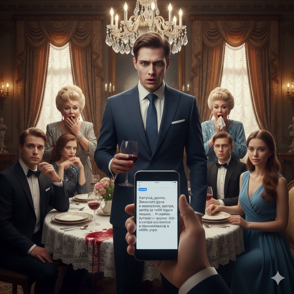 Артем скользнул взглядом по экрану, и его лицо вдруг начало менять цвет. Сначала оно стало мертвенно-бледным, потом пошло красными пятнами. Он осекся на полуслове, его бокал дрогнул, и капля красного вина упала на светлую скатерть.