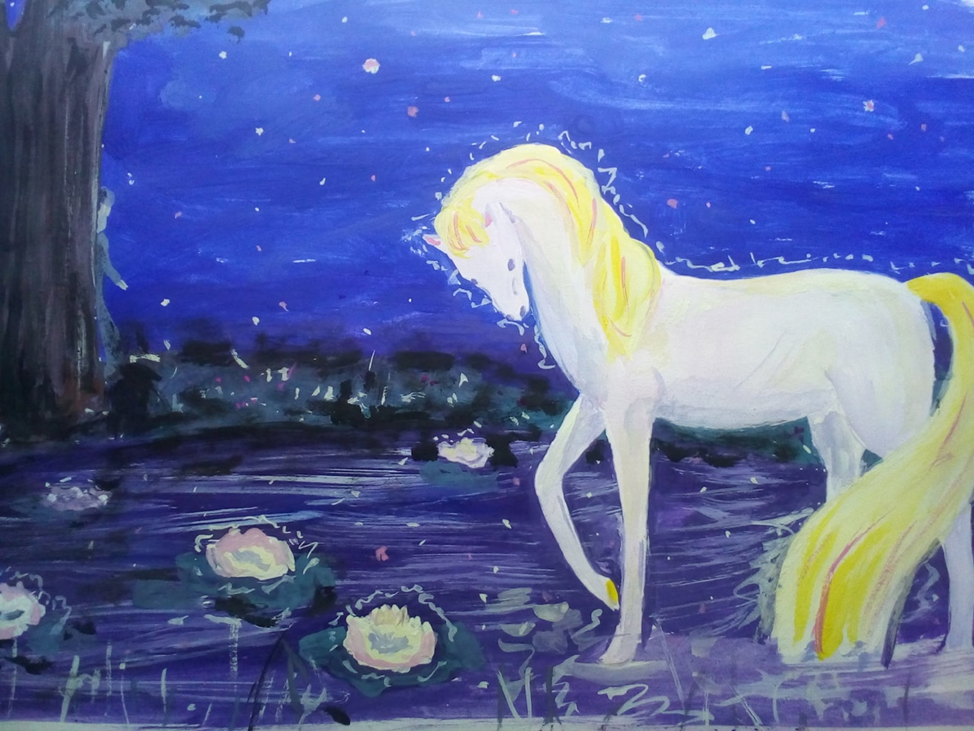 Вдруг слышит ржание. Поднял голову – а по пескам скачет конь небесной красоты. Сам нежно розовый, словно утренняя заря, а грива и хвост золотые. От восхищения Джириш дар речи потерял.