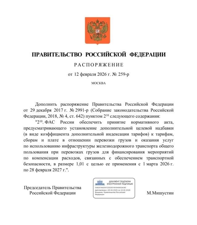 С 1 марта 2026 года тарифы на перевозки по Российской железной дороге вырастут на 1%. Соответствующее распоряжение в адрес Федеральной антимонопольной службы (ФАС) подписал председатель правительства РФ Михаил Мишустин. В документе говорится, что надбавка необходима для «финансирования мероприятий по компенсации расходов, связанных с обеспечением транспортной безопасности». Ранее министр финансов Антон Силуанов сообщал, что компания решает вопрос с выплатой долгов и работает с банками над реструктуризацией займов. В декабре 2025 года РЖД утвердили план по расходу средств на нужды компании и ее развитие на 2026 год, сократив его примерно на 20% по сравнению с предыдущим годом.