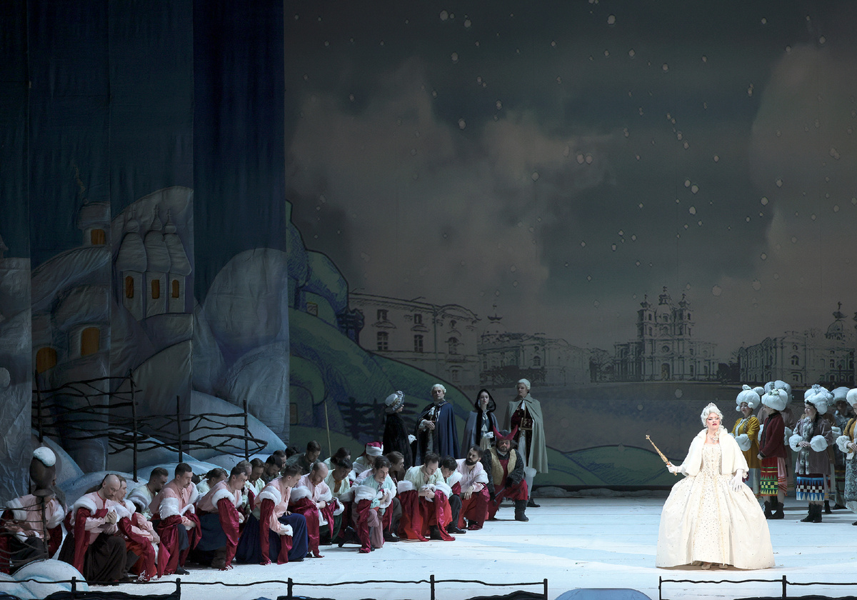 Собственную «Ночь» Большой ставил в последний раз еще при советской власти – спектакль Александра Тителя 1990 года давно сошел со сцены. Но мариинскую версию от Ильи Живого и Ольги Маликовой с прежней габтовской роднит то, что это максимально демократичная, рассчитанная на самую широкую аудиторию постановка. Сцена затянута бело-голубыми полотнищами, говорящими о декабрьских морозах. Небольшие хаты стоят укутанные снежным покровом, люминисцентные звезды и месяц спускаются с колосников — так выглядит большая часть картин. Важную роль играет беленая печь, которую периодически выкатывают на сцену. За ней Солоха прячет мешки со своими кавалерами, на ней Пацюк уписывает самозапрыгивающие в рот галушки, на ней, превратившейся в причудливый «лайнер», нечистая сила пытается помешать Вакуле достичь Петербурга. Герои в традиционных малороссийских одеждах — парубки в шальварах, дивчины с венками на головах и лентами в косах и в неизменных красных сапожках. Все в этом действе узнаваемо, все так или почти так, как вы себе представляли диканьские приключения по книжкам или старым фильмам.