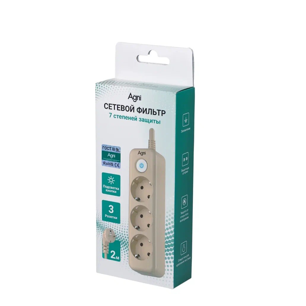 Лидером рейтинга стал AGNI TP-FD5E — сетевой фильтр, подходящий для большинства компьютерных рабочих мест. В нём пять розеток с заземлением: можно подключить компьютер, монитор, роутер, колонки и лампу без дополнительных тройников. Максимальная нагрузка — 4000 Вт (16 А); этого хватает даже для мощной сборки или игрового ПК с периферией. Для полного отключения всей техники предусмотрена одна большая кнопка питания с подсветкой.