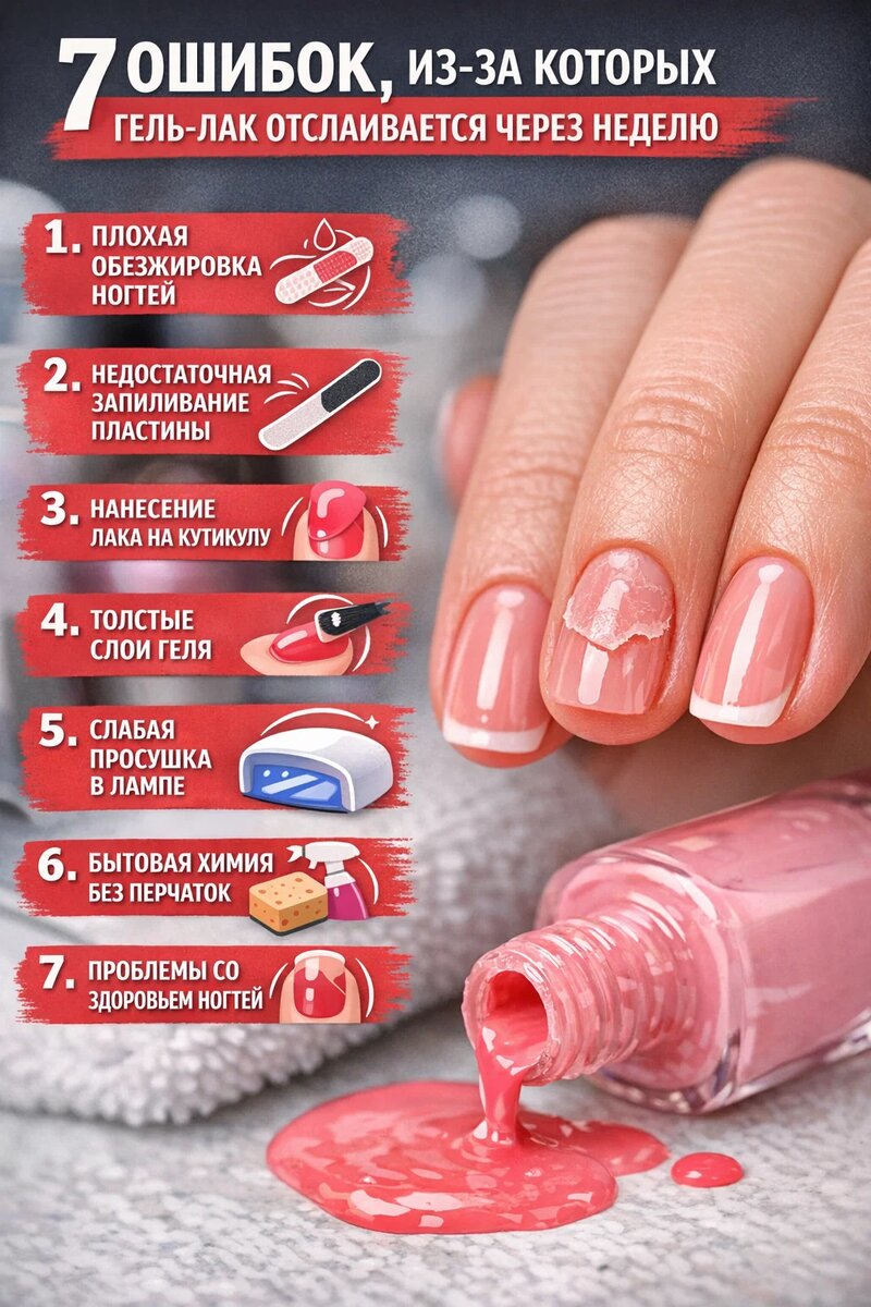 Причина — в деталях технологии. Разбираем 7 самых частых ошибок. Если на ногте осталась: адгезия нарушается. Даже самый дорогой материал не будет держаться, если база нанесена на плохо подготовленную поверхность. Особенно часто ошибка возникает при спешке. Слишком активное снятие глянца истончает верхний слой ногтя. В результате: Правильная матовка — это лёгкое снятие блеска, а не агрессивная шлифовка. Плоский ноготь без выстроенного апекса — частая причина отслоек. Когда нет правильного распределения материала: Особенно это заметно на длинных ногтях. Ошибка «чтобы держалось лучше, нанесу побольше». На практике: Лучше 2 тонких слоя, чем один плотный. Причины: Если база или цвет не просушены полностью, сцепление нарушается. И отслаивание появляется через 5–10 дней. Мелкая маникюрная пыль остаё