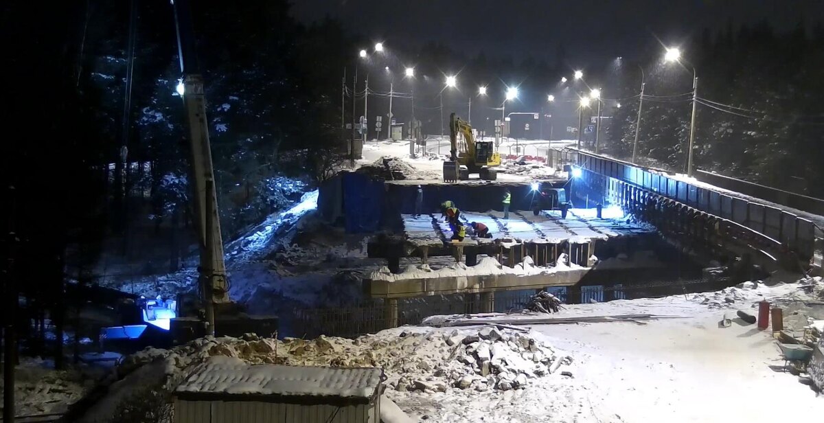 В Курортном районе Санкт-Петербурга продолжается капитальный ремонт Рубежного путепровода, стартовавший в ноябре 2025 года. Специалисты завершили один из самых сложных этапов – демонтаж пролёта над железнодорожными путями. Работы велись в строго ограниченные «технологические окна», предоставленные ОАО «РЖД», с обязательным отключением контактной сети. На сегодняшний день также выполнено устройство буронабивных свай для опор №1 и №4, продолжается сооружение тела опоры. В связи с активной фазой работ изменена схема движения: двусторонний проезд организован по полосам направления Санкт-Петербург – Выборг. Также перенесены сети наружного освещения. Согласно проекту, обновлённый путепровод останется трёхпролётным, но опоры возведут со смещением относительно старых фундаментов. Общая длина сооружения 58 метров. Крайние пролёта составят по 17 метров, центральный – 24 метра. Проезжая часть будет включать четыре полосы шириной 3,5 метра каждая с метровыми полосами безопасности. Для пешеходов и