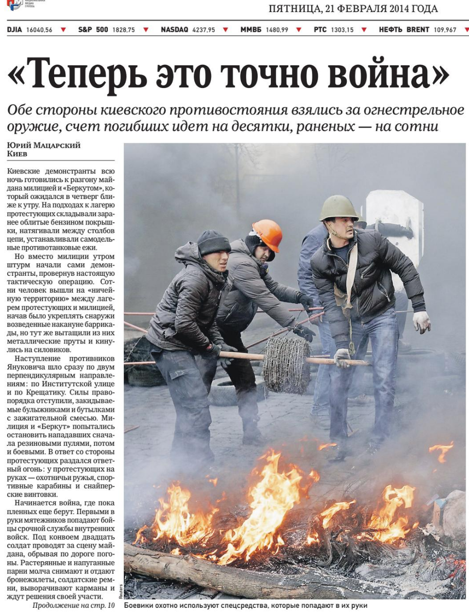 «Газеты – консервы времени» (Карл Краус) 21.02.2014 – Известия 21 февраля – значимая дата в истории Украины. Последний день правления Януковича, переход власти к оппозиции, шаг к глубокому внутреннему конфликту в стране, который вскоре приведет к потере Крыма, затем перерастет в открытое военное столкновение в Донбассе. К этому дню Украина подошла в состоянии хаоса. Столкновения оппозиции и силовиков приняли кровавый характер. 20 февраля неизвестными снайперами на Майдане убито несколько десятков человек с обеих сторон. Во многих городах радикально настроенные украинцы захватили административные здания, милицейские отделения, здания СБУ. В их руках появилось много оружия. Под давлением европейских политиков 21 февраля Янукович подписал с лидерами оппозиции соглашение, которое прекращало вооруженное противостояние, проводились президентские выборы, оппозиция сдавала оружие, силовики отводились из правительственного квартала и Майдана. Свидетелями и гарантами выполнения условий были мини
