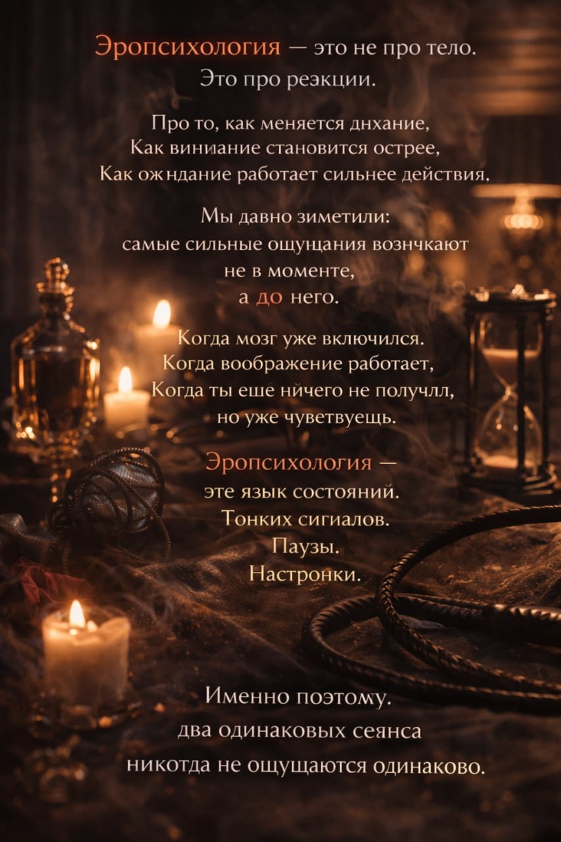 Устали принимать решения? Чувствуете, что внутри натянутая струна, которая вот-вот лопнет? Сегодня мы хотим поговорить о термине, который многих интригует, но мало кто понимает по-настоящему. Эропсихология. Звучит загадочно? Возможно. Но для нас это язык, на котором говорит ваше тело, когда ум наконец-то замолкает. Многие думают, что массаж — это просто разминка мышц. Для нас это не просто массаж. Это глубокая работа с вашим внутренним состоянием. Мы объединили классические техники восстановления с элементами тактильного интеллекта и профессиональной психологической разгрузки. Мы не работаем по шаблону. Ваш стресс уникален, значит, и ключ к расслаблению должен быть индивидуальным. Наша программа строится на трех китах: ✅ Ментальная перезагрузка
