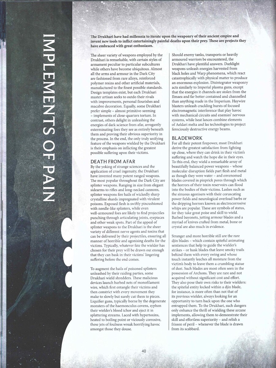 Друкари за тысячелетия многократно усовершенствовали вооружение своей древней империи и изобрели новые орудия, дабы доставлять своим жертвам как можно большую мучительную смерть — истинное развлечение для тёмных эльдар. К подобным проектам друкари относятся с огромным энтузиазмом.