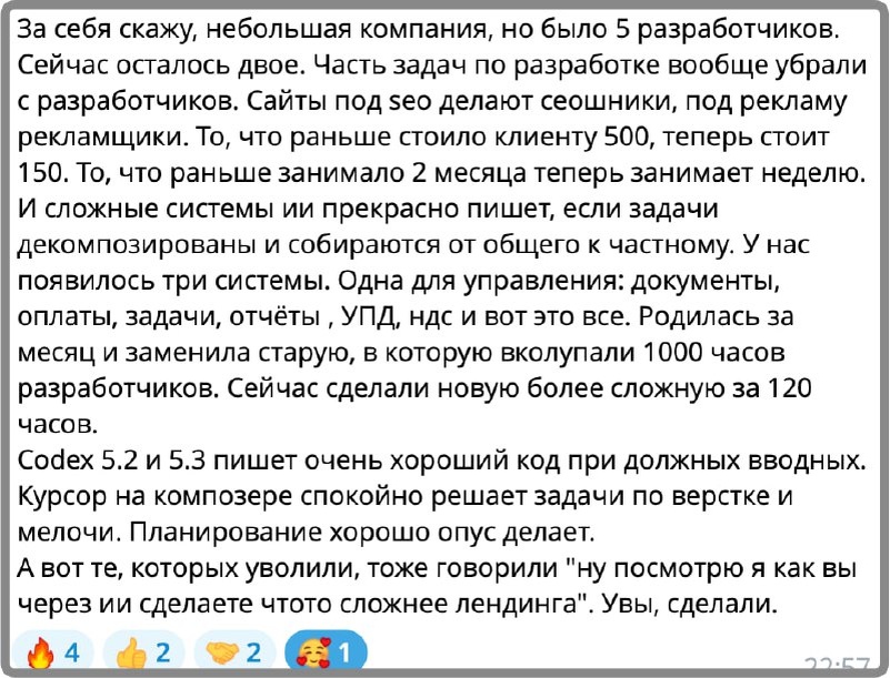 Вот, пишут в чате (спасибо) - делятся опытом. Было 5 программистов, осталось 2 и вполне себе справляются. А 3-е ушли "на мороз" и ищут работу. Получается, что ИИ вполне себе вытесняет людей из ИТ рынка. Да в общем почитайте на картинке. Русский ИТ бизнес