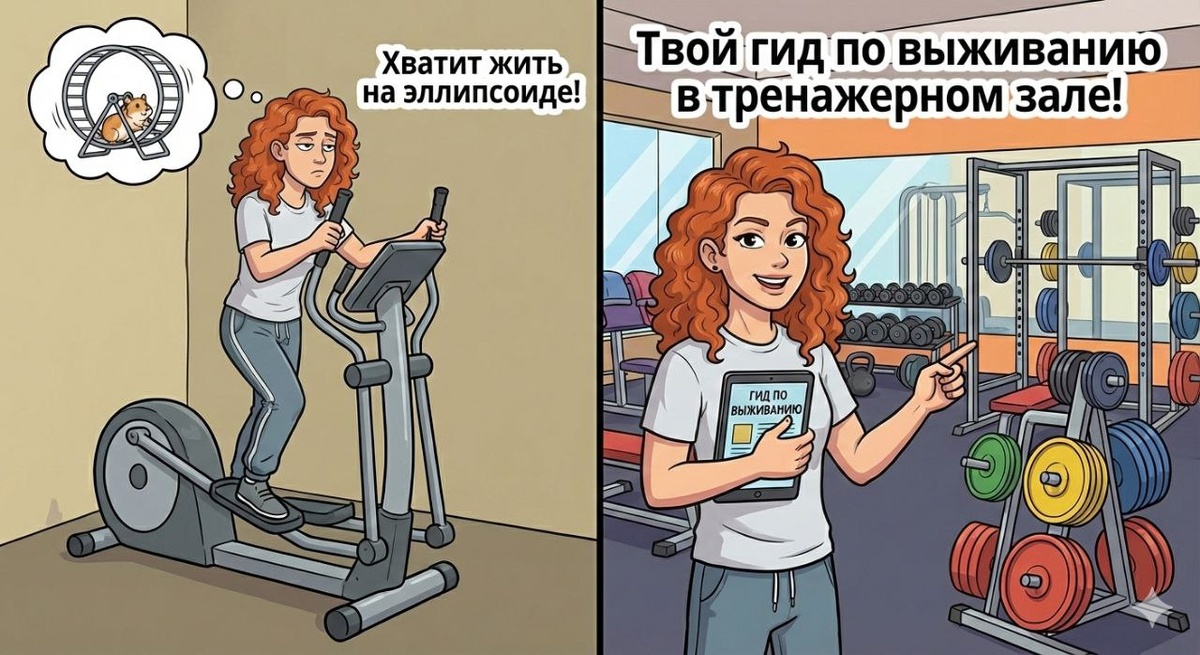 ! Если бы мы знали, что это такое, но мы не знаем, что это такое! Хорошо, когда в спортзале есть вводный инструктаж или вводная тренировка, где инструктор ознакомит с оборудованием и спецификой работы на нём. Не стесняйтесь, пользуйтесь такой возможностью. Не устану повторять - быть новичком не стыдно, стыдно ничего не делать. Часто же вижу, что девчонки приходят и теряются среди тренажёров, не знают, с какой стороны к ним подойти. Тогда им приходится занимать наблюдательный пункт «эллипсоид». Плюсы: кардио Минусы: не весь зал видно, (у нас вообще в окно приходится смотреть) Ладно, шутки шутками, но пора освободить кардио-зону и уверенно зайти в зону свободных весов. 🧱 Твой «Золотой стандарт» базы: 🥌 Кубковые приседания (Goblet Squat) Что делать: Держи одну гантель/гирю у груди и приседай. Почему: Это безопаснее для спины, чем штанга, и сразу учит правильной технике. 🥌Выпады на месте Что делать: Шаг назад (безопаснее, чем вперёд) и опускание колена к полу. Почему: Лучшее упражн