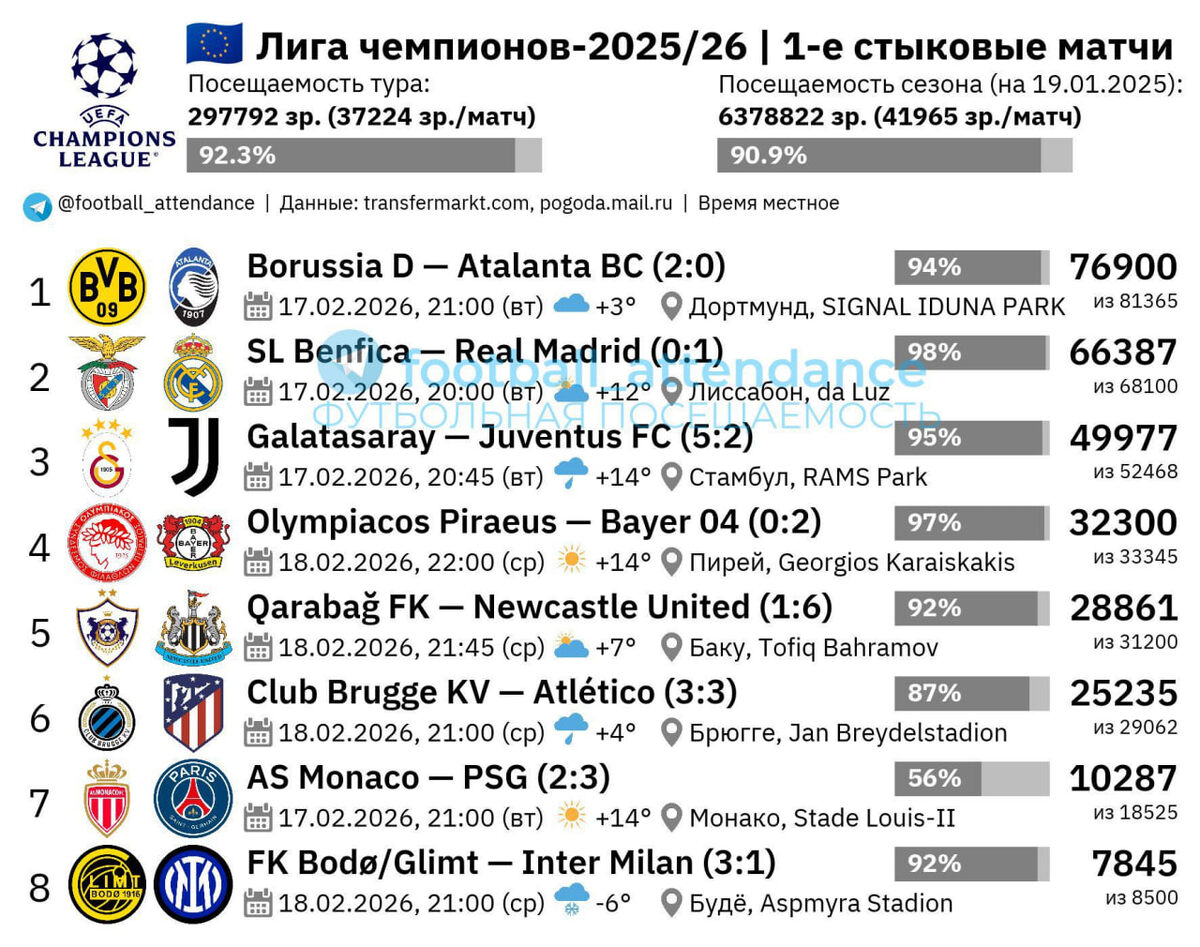 Аудитория первых матчей «стыков» была антирекордной для всех игровых недель в текущем розыгрыше Лиги чемпионов — в среднем на каждой встрече были 37224 зрителя. До этого минимальной была аудитория 2-го тура общего этапа (37905). Если дома играет «Боруссия», то она всегда будет первой по аудитории, однако в этот раз вместо традиционно нарисованного аншлага в 100% вместимости «Вестфалленштадиона» указаны округлённые 76900 на игре с «Аталантой». Всему виной транспортный коллапс из-за другого крупного концерта в городе, из-за которого стартовый свисток футбольного матча был перенесён на несколько минут. «Бенфика» установила рекорд домашней посещаемости в истории стадиона «да Луж». Благодаря увеличенной вместимости новый матч с «Реалом» увидели 66387 человек. В целом, низкая аудитория обусловлена во многом невысокой вместимости стадионов домашних команд конкретно в этом туре. На пяти из восьми матчей вместимость была 33 и менее тысяч мест. Стадион в Будё (8500 мест) не прошёл бы даже лиценз