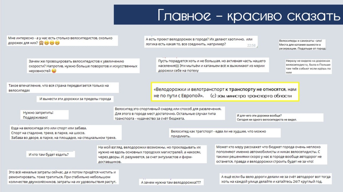 Особенно такой, который связан с изменением сознания и поведения людей. Проект создания велосети требует серьезной информационной поддержки и работы с обществом. Я выяснил, что большинство гневных комментариев в отношении развития велодвижения не от того, что жители действительно ненавидят велосипедистов ( хотя есть и такие) а потому что жителям не рассказали доступным языком цели, задачи и плюсы развития велодвижения Инфоподдержка - это не просто несколько постов в год с темой «там будет велодорожка» или «мы встретились с велосообществом», а системна работа,. какую например ведет в том числе и мой канал Это снизит негатив к проектам администрации и повысит информационную культуру.. Я об этом говорю уже несколько лет. Пока что до сих пор встречаются цитаты, подобные выделенной желтой рамкой. Это не приводит к информированию населения и повышению лояльности к проектам, А, судя по информационному фону - результат наоборот противоположный.