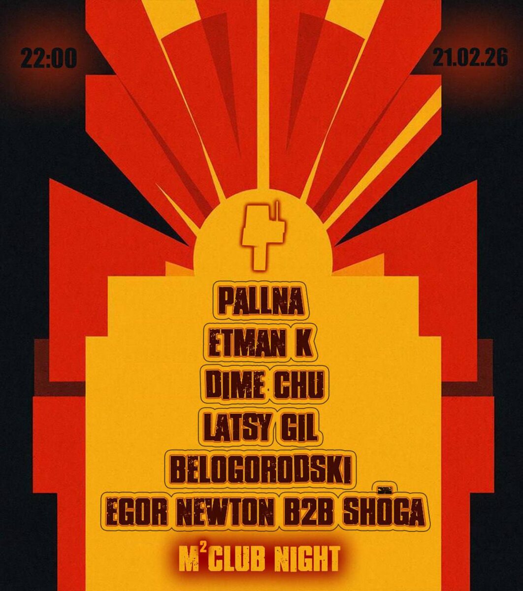 Яркое солнечное торжество, красота встречи весны, революция чувств. Приминимализованная клубная ночь, где ритуальное открытие сияющего звукового селектива обозначает грувовые ритмы до утра. Тепло внутри поддержат тинктуры с меню, а движения тел в танце утвердят законы геометрии. 22:00 latsy gil 23:30 pallna 01:00 dime chu 02:30 belogorodski 04:00 etman k 06:00 shōga b2b egor newton 🎫 Вход 500₽ FC 18+ 📆 21 февраля, в 22:00 📍М2, Москва, Наставнический переулок 13-15 стр. 2