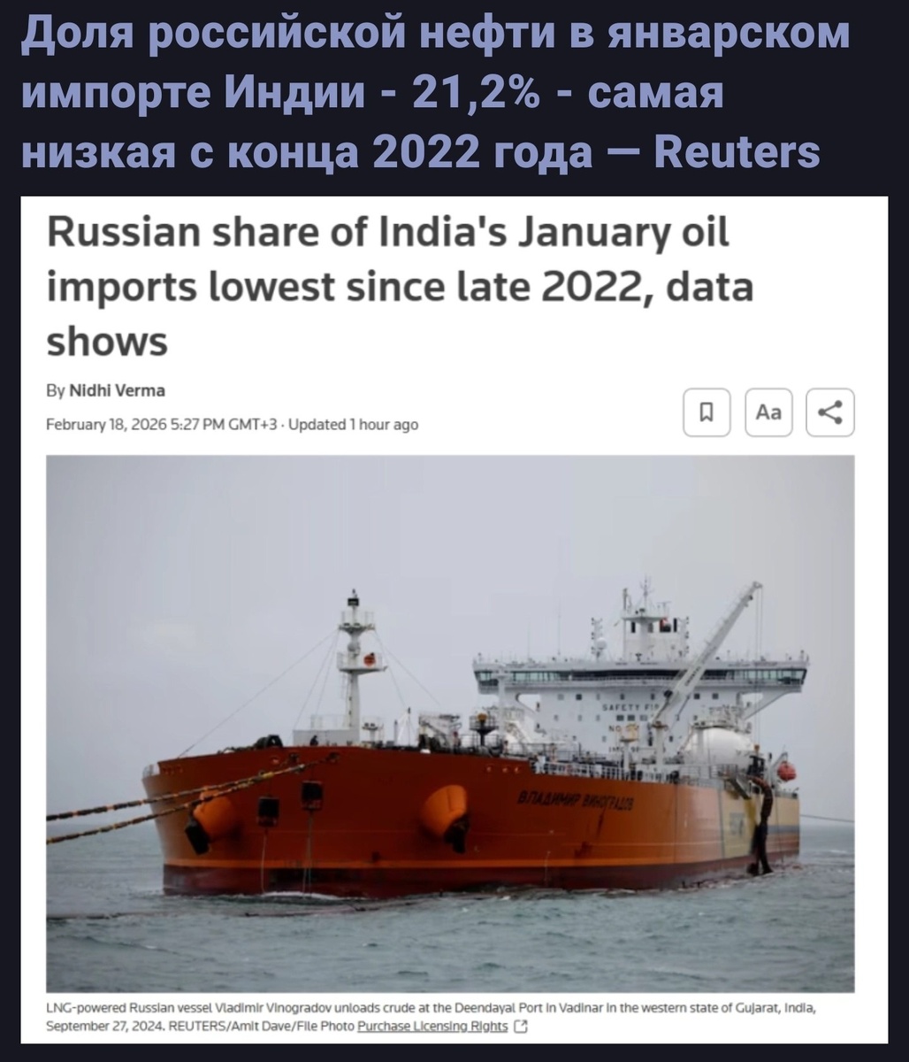 В январе 2026 года доля российской нефти в индийском импорте упала до самого низкого уровня с октября 2022 года, составив всего 21,2%. Обвал поставок российского сырья происходит на фоне стремительного роста закупок на Ближнем Востоке, доля которого достигла 55% – впервые с осени 2022 года Саудовская Аравия вернула себе статус главного поставщика Индии. Поставки из РФ сократились до 1,1 млн баррелей в сутки – на 23,5% меньше, чем в декабре, и на треть ниже прошлогодних показателей. Обвал может стать ещё больше: аналитики Kpler прогнозируют дальнейшее падение до 800 тысяч баррелей в марте. Даже в среднесрочной перспективе российский экспорт в Индию будет только сжиматься. Кроме того, Индия быстро наращивает импорт из Венесуэлы. Поставки из Латинской Америки уже занимают до 10% – это максимум за год. Для России, лишившейся европейского рынка, потеря ещё и индийского рынка означает крах всей экспортной стратегии и новый виток экономического кризиса. Но зато вы помните, какой мультик