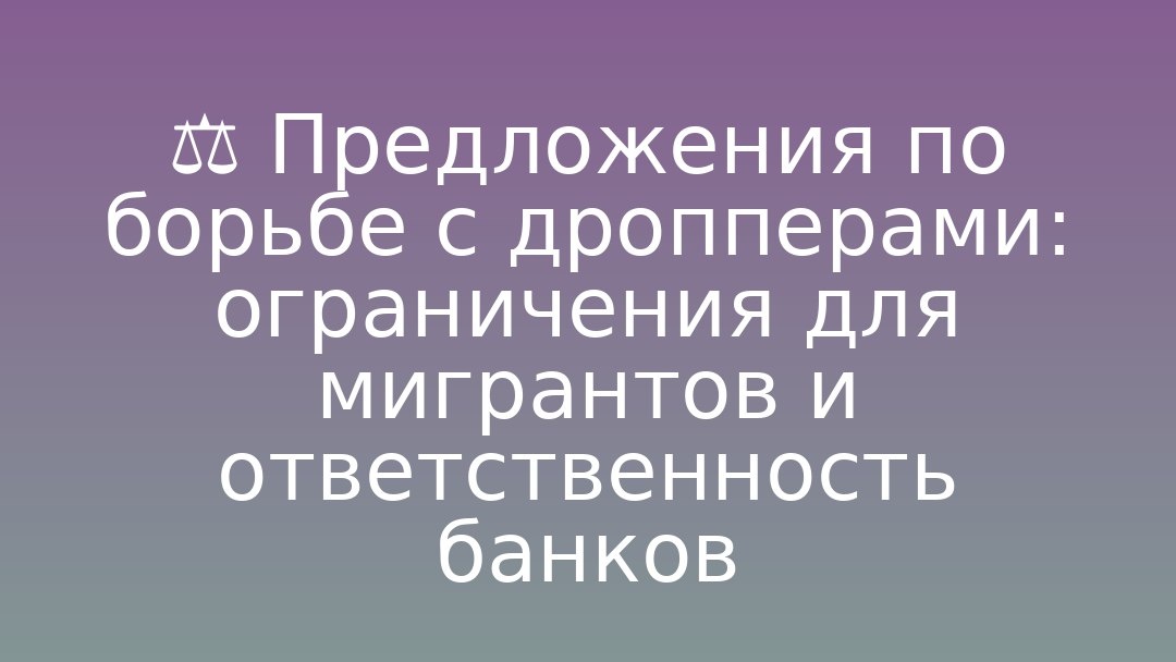 Рассматриваются меры: «один мигрант — один банк» (ограничение количества счетов), открытие счетов для мигрантов только по загранпаспортам, а также уголовная ответственность сотрудников банков за содействие дропперам. Спикер Госдумы Вячеслав Володин поручил проработать предложение об ограничении количества счетов для мигрантов.