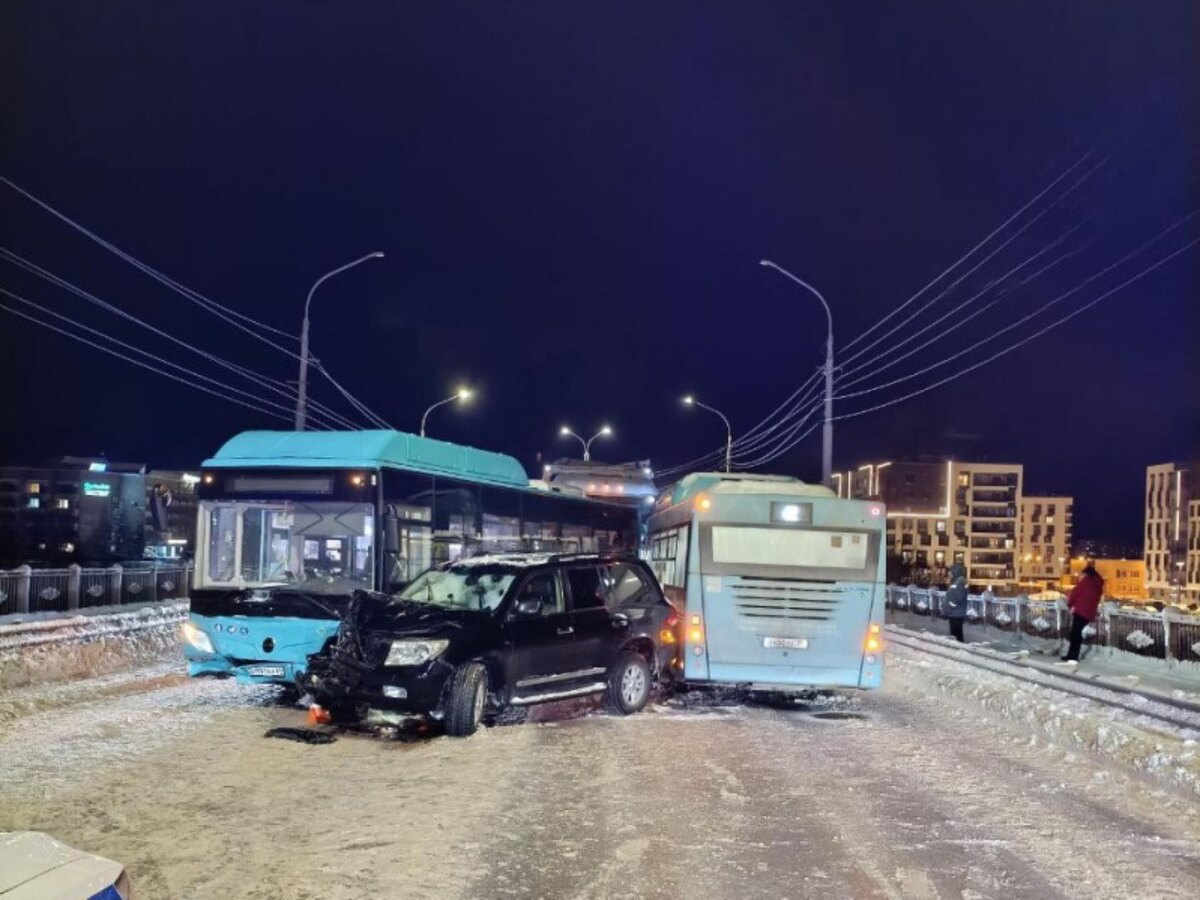 На Кузнечевском мосту в Архангельске столкнулись автобусы и легковушка