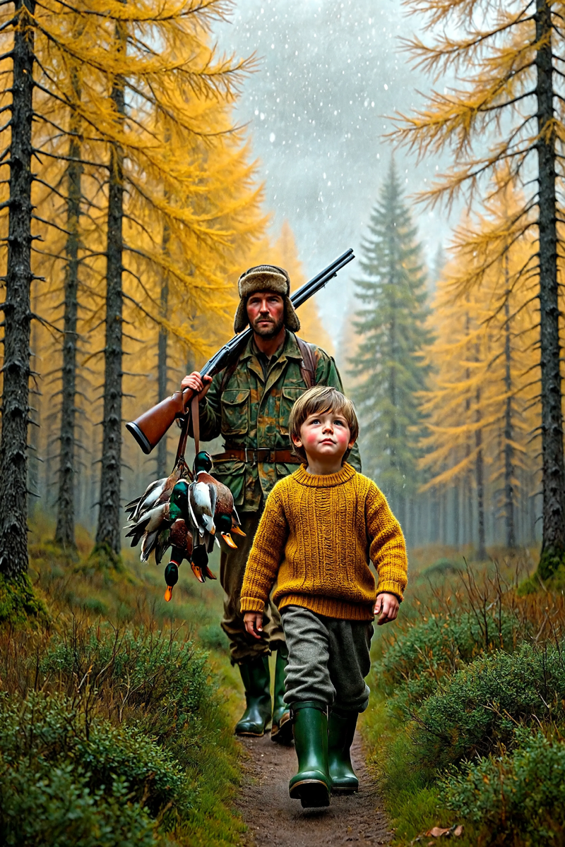 Было мне лет пять, может, шесть. Осень только начиналась — та самая северная осень, когда тайга ещё не умерла, но уже готовилась. Лиственницы стояли жёлтые, мох под ногами пружинил, и пахло сыростью, грибами, чем-то древним. Отец разбудил меня на рассвете. — Вставай, — сказал он негромко. — Пойдём со мной. Я не спрашивал куда. Просто оделся, натянул резиновые сапоги и вышел за ним на крыльцо. Было холодно, но не по-зимнему. Серое небо висело низко, словно придавливало тайгу к земле. Мы пошли по профилю — так здесь называли заросшие дороги, которые когда-то проложили вездеходы. Теперь это были просто тропы, по которым можно было идти, не продираясь сквозь кусты. Трава доходила мне до пояса, ветки задевали лицо. Я шёл за отцом и не понимал, куда мы идём и зачем. — Далеко ещё? — спросил я. — До озера. Километр всего. Километр для меня тогда был как вечность. Лиственницы росли прямо из вечной мерзлоты, вросшие корнями в жёлтый мох и ягель, который стелился повсюду, мягкий и влажный. Между