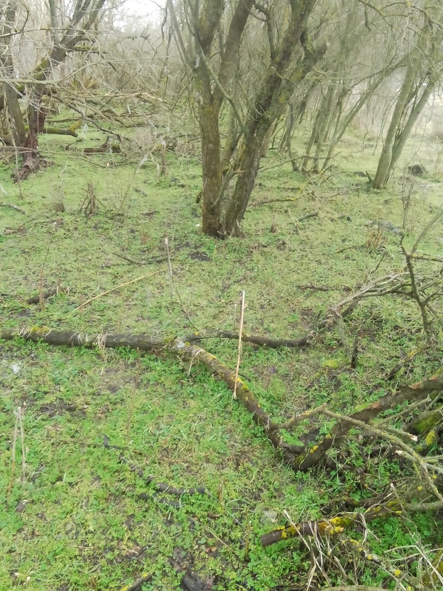 Ну находки конечно как чермет неплохие а всё же хотелось бы чего то поинтереснее. И я подумал - а не проверить ли местечко, где утром я нашёл патрон, и раньше находил подобное. Решил идти сразу туда, к ямам, которые я определил как воронки. Вот самая большая из них, её можно разглядеть, несмотря на то что камера совершенно не передаёт форму рельефа. Снег, оставшийся на её дне этому способствует.