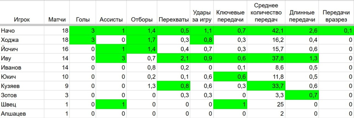Собственно, посмотрите на табличку: Игнасио в топе лучших по голам, ассистам, отборам, перехватам, ударам за игру, ключевым передачам, среднему количеству передач, длинным передачам и даже пасам вразрез. Просто монстр. Конечно, стоит учитывать, что стиль игры у Рубина Рахимова и Сочи Морено/Осинькина разный. Но, как видим, Начо хорош не только в атаке, но и в обороне. Вполне вероятно, что он даже будет играть в паре с Иву, когда тот полностью выздоровеет - и это может быть убойной связкой. ❤️ Злобный Рубин ❤️ Мы в ВК ❤️