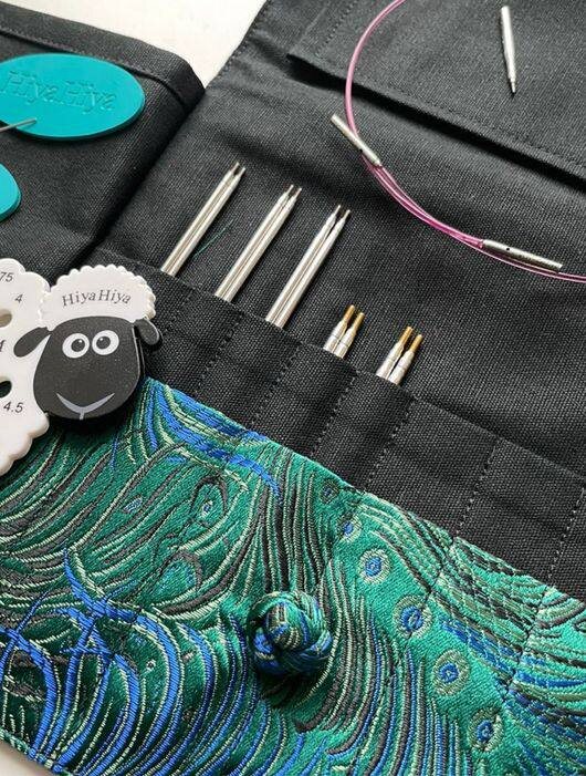 Хочу сразу отметить, что многие сравнивают их с ChiaoGoo. Сходство действительно есть, прежде всего, в системе: спицы идут с тросиками разной толщины под разные диапазоны размеров. Их три: для спиц 2–2.5 мм,/ для спиц 2.75–5 мм,/для спиц 5–10 мм. Кончики у HiyaHiya закруглённые, но чем меньше номер спицы, тем они острее. Можно купить большой набор «максимум» — например, с номерами от 2.75 до 10 мм. Длина спиц обычно 10 или 13 см. Я заметила, что в такие большие наборы часто сразу вкладывают переходник (так называемый стакан-удлинитель). Такой стакан позволяет плавно уменьшить диаметр спицы от кончика к леске. Обладатели очень хвалят эту деталь, отмечая, что при плотном вязании петли на левую спицу наезжают просто идеально. Помимо этого, в комплект обычно входит много полезного: коннектор для соединения спицы большего размера с тросиком меньшего, заглушки (иногда в виде бусин или зверушек), соединители для лесок, ключ и специальные диски для удобного закручивания. Теперь про органайз