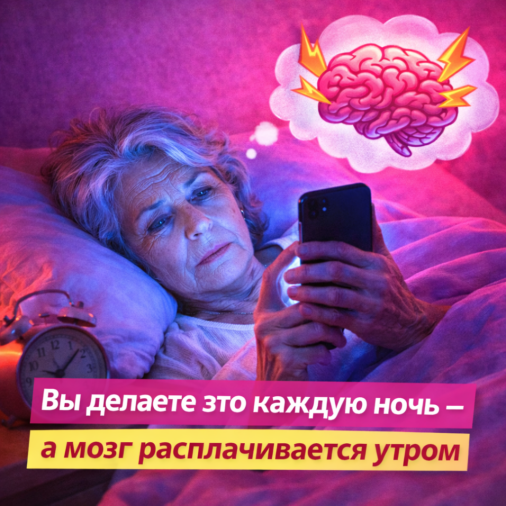 1. Подавляется мелатонин. Синий свет экрана блокирует выработку гормона сна. Даже 20 минут телефона перед сном отодвигают засыпание на 1–1,5 часа. У пожилых людей мелатонин и без того вырабатывается хуже — экран делает ситуацию критической.