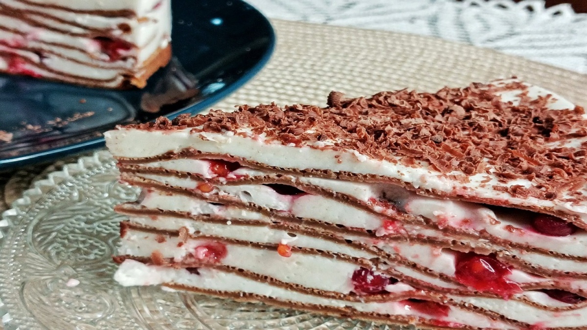для теста 500 г. муки 200 г. молока 2 яйца 2 ст. л. какао 2-3 ст. л. р. масла для крема 500 г. сметаны 1 ст. сахарной пудры 20 г. желатина 100 г. воды для желатина ягоды любые Из муки, молока, яиц, какао замесить тесто для блинчиков. Выпечь блинчики на хорошо разогретой сковороде с двух сторон. Желатин залить водой и оставить для набухания. Набухший желатин растопить на водяной бане или в микроволновке. Смешать со сметаной, сметана не должна быть холодной иначе желатин начнет застывать. Смазать блинчик кремом, выложить ягоды и накрыть другим блинчиком. Собрать торт и поставить в холодильник для застывания. Подать к чаю с вареньем или ягодным сиропом.