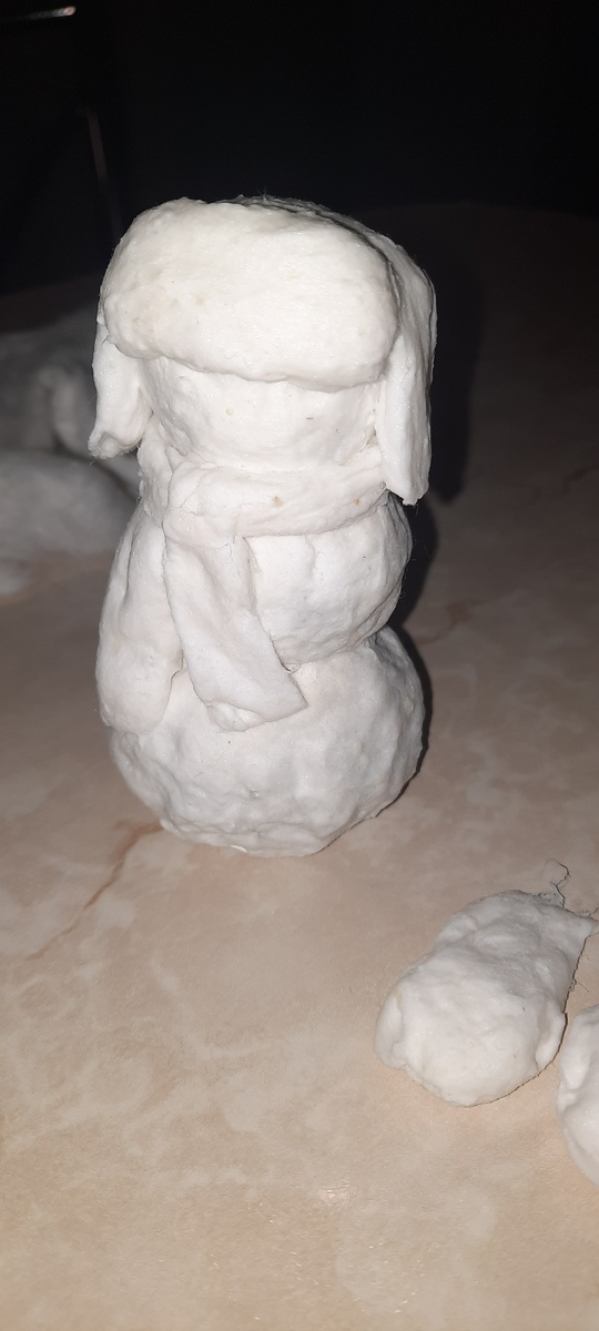 Это был снеговичок. Лепила я его высунув язык 😁 Вата не слушалась меня, но кое-как поддалась. После просушки я даже не хотела за него снова браться, чтобы доделать. Мне казалось, что ничего путного у меня опять не получится. Пересилила себя и снова принялась за работу.