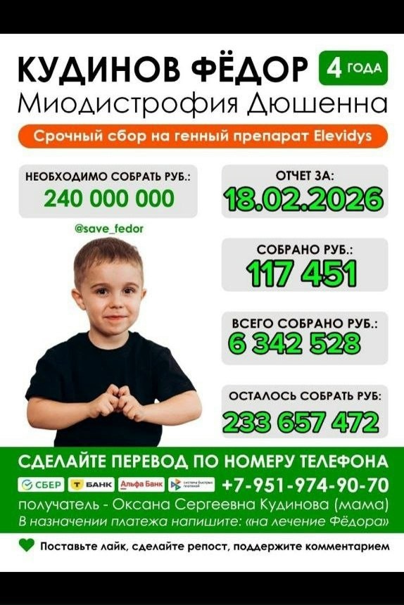 Маленький Федя Кудинов, которому поставили диагноз «мышечная миодистрофия Дюшенна», борется за здоровую жизнь. Цена победы в этой борьбе — приобретение препарата «Элевидис» за 240 миллионов рублей. Это стоимость одного, жизненно необходимого укола. Сумма — огромная, но вместе её можно собрать. Даже 100, 200 или 500 рублей — это значительный вклад в спасение ребёнка. Все реквизиты для перевода, история семьи и медицинские документы собраны в официальном канале семьи: @save_fedor Поделитесь этим сообщением, расскажите о Феде своим друзьям, знакомым, в родительских чатах. Пусть как можно больше людей узнают о его истории. Иногда один репост спасает жизнь. Силы одной семьи в такой ситуации ограничены. Им нужна наша помощь, поддержка и вера. Давайте сделаем это вместе, Анапа! Новости Анапы в MAX