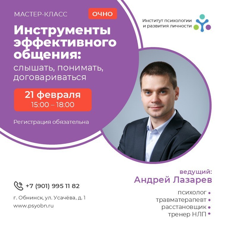 , договариваться». Что будет на мастер-классе? 🔺Вы получите не теорию, а конкретные речевые модули. 🔺 Отработка каждой техники. 🔺Разбор реальных кейсов 🔺 Живое общение и ответы на вопросы. Подробнее о программе и условиях участия: ЗДЕСЬ ↖️ ⏰ 21 февраля (суббота) | 15:00-18:00 📍Регистрация:https://forms.gle/ihz9RNE4RKRL81oq5 🚩Формат: очно, г. Обнинск, ул. Усачева дом 1 Приходите за готовыми инструментами, которые сможете применить сразу же после мастер-класса.
