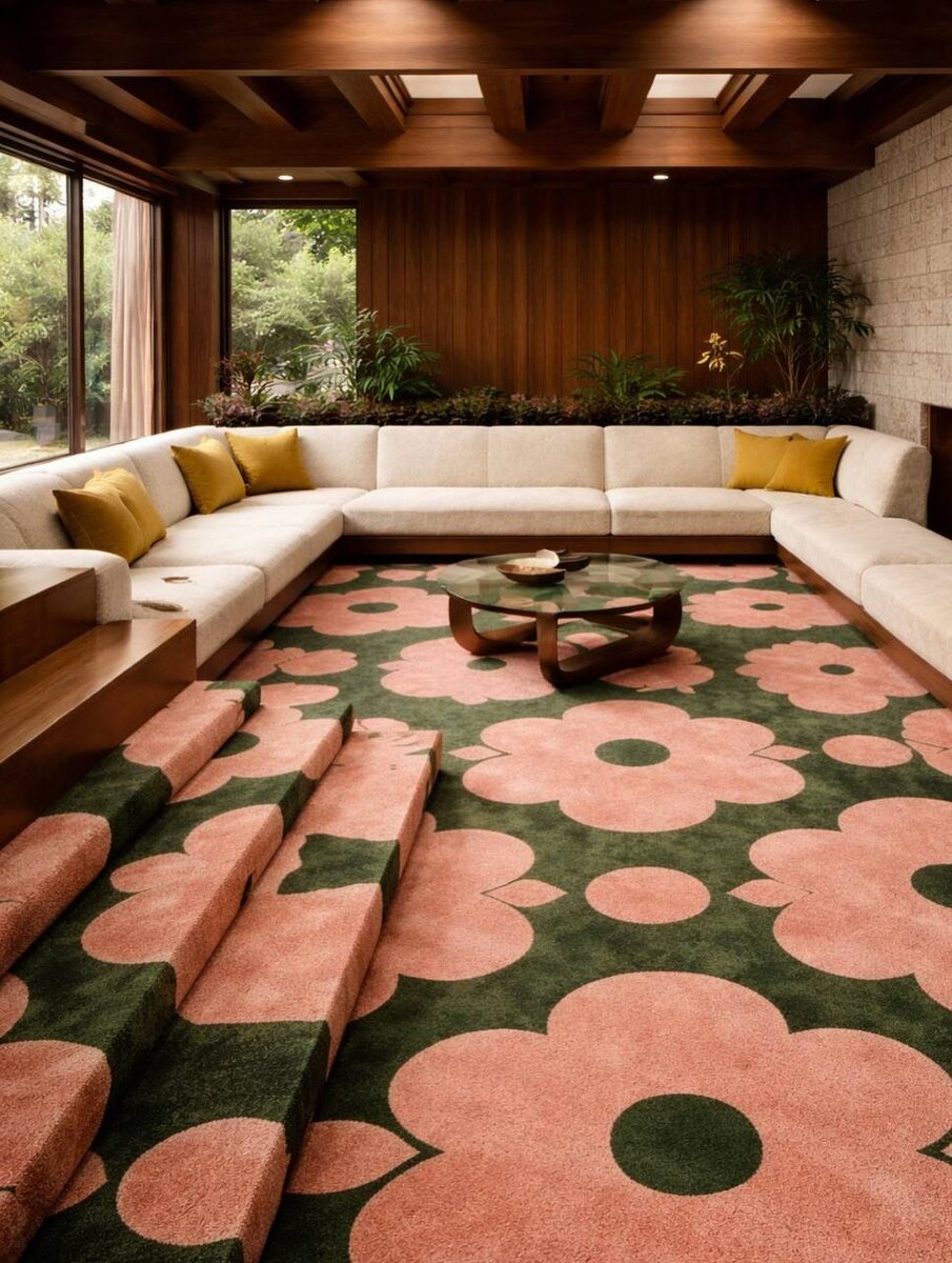 💭 В реальных домах 60-70х wall-to-wall carpeting действительно был распространён: ковролин стелили от стены до стены, заводили на ступени, использовали в гостиных и спальнях Работы AI-проекта UNREAL HAUS