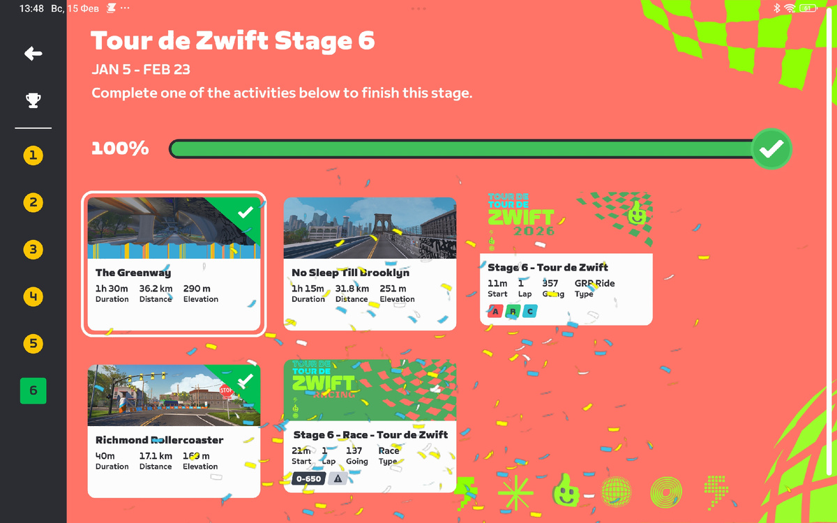 Скриншот от 15 февраля. Тут мне нужно проехать всего одну, последнюю гонку из всего ZWIFT тура, чтобы получить главный бонус — 11.000 ХР. Самое интересное впереди 🤠.