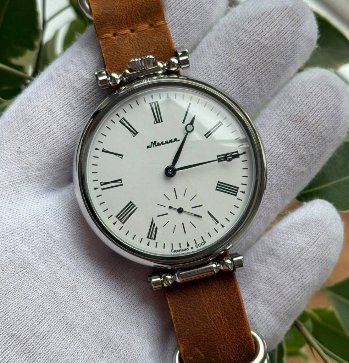 перспективы. Итак, № 1 — это ручная работа, так называемый марьяж — это когда карманные часы переделываются в ручные, и именно таким вариантом выступает номер один. Механизм от советских часов «Молния» в новом корпусе для наручного использования. Цена, что-то до 30 тыс. рублей. Второй вариант — это российский бренд «Нестеров». О нём можно сказать, что у него есть вот такие большие часы, и цена их чуть больше 20 тыс. рублей. Вариант № 3 — это классические швейцарские часы пилотской серии от производителя IWC, который ещё во Вторую мировую поставлял хронографы для люфтваффе. Сейчас цена такой модели составляет около 1,2–1,5 млн рублей. Что до № 4, так это, пожалуй, самый интересный вариант: Laco B-Uhr 55 mm — часы пилотов бомбардировщиков люфтваффе от знаменитого швейцарского часового дома. Оригинал сейчас почти не найти, а реплика от производителя стоит около 5 тыс. евро. И наконец, самый популярный вариант — № 5. За ним у нас скрывается знаменитый часовой бренд «Aviator» с моделью