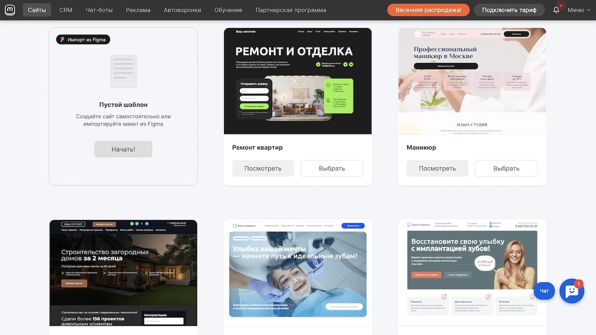 Шаблоны: есть готовые шаблоны сайтов, они разбиты по сферам бизнеса. Можно сделать сайт с нуля из готовых блоков.