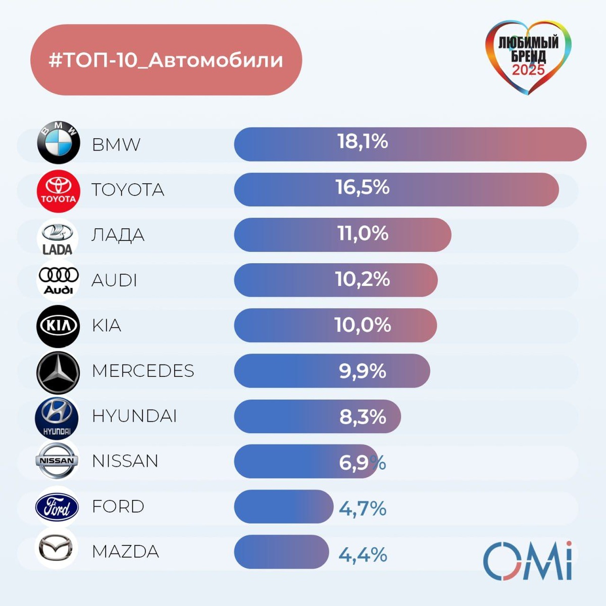 В категории «Автомобили», ушедшие из России бренды всё ещё любимы. Но в тройке лидеров изменение: на третьем месте в 2025 году российский бренд ЛАДА. Лидерство по прежнему у BMW, Toyota поднялась на второе место, Mercedes-Benz выбыл из тройки и разместился на шестом месте. Audi и Kia поменялись местами: Audi теперь на четвёртом, а Kia — на пятом. Hyundai поднялся с девятой позиции на седьмую, сместив Nissan на восьмое место. На девятой строчке расположился Ford, который отсутствовал в Топ-10 категории с 2021 года. Завершает рейтинг Mazda, пропустившая лишь год в десятке. 📈 Тенденции рынков - подписаться