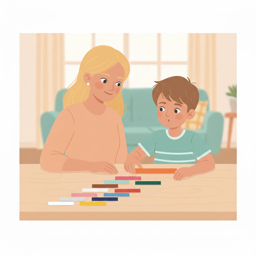 На что обратить внимание: ребёнок не должен угадывать. Он именно прикладывает палочки и проверяет физически. Если он пробует неправильную палочку — отлично! Он увидит, что она не совпала, и это ценный опыт.