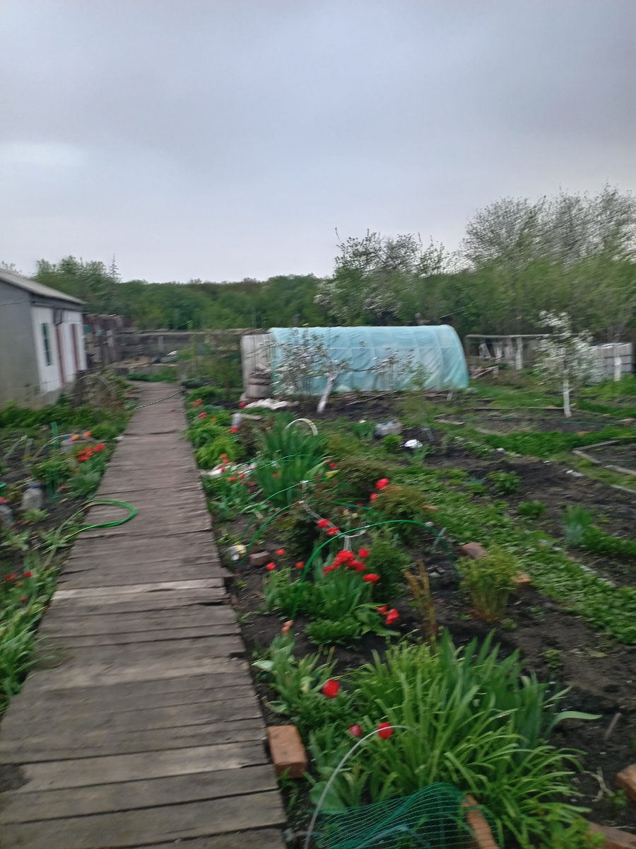 Это участок.В первую весну, когда только сошел снег, я увидела голую, как будто выжженную землю, около крыльца был маленький кусочек травки с качелями, остальное голая почва. Потом мне рассказали, что предыдущая хозяйка во дворе выращивала помидоры в промышленных масштабах, потом ей просто перепахивали его мотоблоком, а цветы росли только вдоль дорожки тоненькой полоской.
