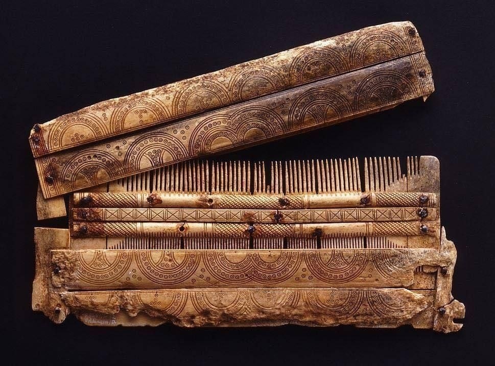 Средневековый двухсторонний костяной гребень, найденный в могиле воина во Фридиндене, Германия. Для защиты зубцов расчёску хранили в футляре. Начало VII века нашей эры. Сейчас находится в Landesmuseum Württemberg Терра инкогнита | Неизвестная земля