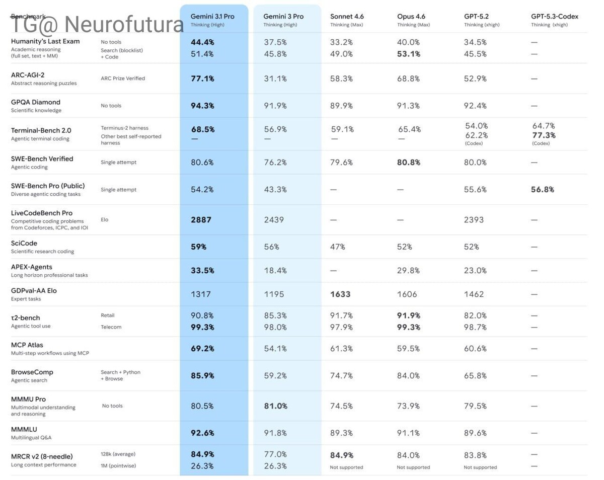 И это, похоже, новый король в кодинге и агентных задачах! 🔥 На самом сложном тесте абстрактного мышления ARC-AGI-2 модель выдала 77.1% — это в 2+ раза лучше предыдущей версии и обходит даже Claude Opus 4.6 и GPT-5.2. Плюс прокачали базу: теперь генерит анимированные SVG по тексту и решает абсолютно новые логические паттерны, которых не видело в обучении. Google снова жёстко зашёл! #Gemini #Gemini31Pro #AI #Нейросети #GoogleAI #Кодирование #ARCAGI #ИскусственныйИнтеллект Наш телеграмм канал t.me/neurofutura