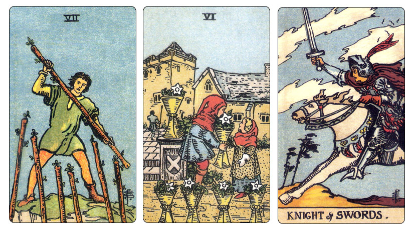 Семерка Жезлов – это успех. Но успех этот нужно еще развить и защитить, закрепиться на той ступени, которую Вы достигли, отбить нападки, преодолеть последние испытания. Еще немного, и успех будет полным. Но пока расслабляться рано. Окружающие карты покажут, как с этим испытанием спрашивающий справится. Или не справится. Рассмотрим на примерах сейчас. Предположим, вот такой расклад выпал: Семерка Жезлов, Шестерка Кубков, Рыцарь Мечей И вопрос такой: «Удастся ли найти более высокооплачиваемую работу в ближайшие три месяца?» Семерка Жезлов говорит о том, что шансы хорошие. У спрашивающего достаточно опыта, хорошее образование, приличное резюме, адекватные притязания. Предложения будут. Но помним, что по Семерке Жезлов, работодатель и других кандидатов рассматривать будет. По Шестерке Кубков какая-то вполне конкретная вакансия появится, куда бы хотелось устроиться. Через бывшего коллегу, к примеру, вакансия эта пришла. Или зовут на старую работу, или же это место, куда ранее уже спрашивающ
